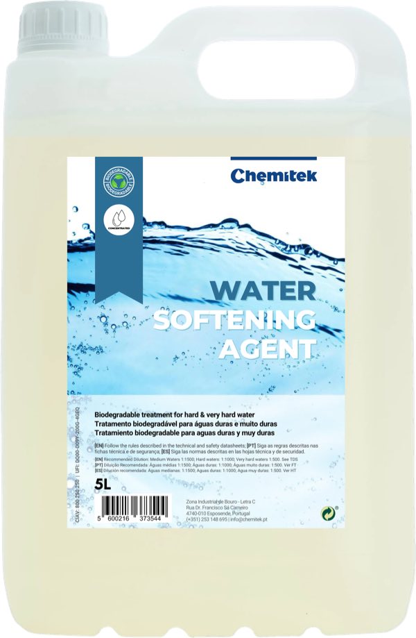 It is a biodegradable product that reduces water hardness by capturing ions, thus preventing the appearance of stains and limescale deposits. It has an action time of about 20 minutes and is compatible with other products marketed by ChemiTek.