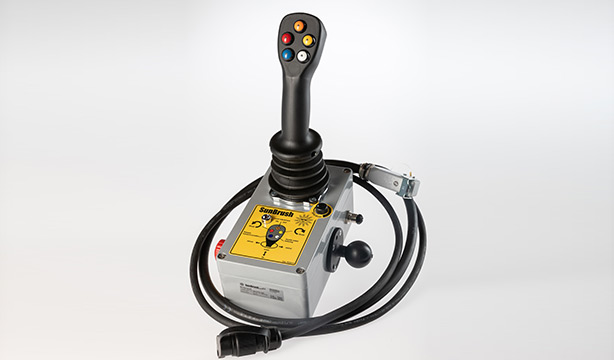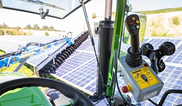 The joysticks on the mini-excavator allow easy control of all functions (lifting, lowering, swivelling, bending) without additional devices. This ensures efficient working in the solar park by swivelling the cleaning brush through 180 degrees – thus no empty runs are needed. The joystick can be easily mounted to the vehicle window without tools by means of a strong suction cup. The 12-volt socket in the vehicle is sufficient as the power supply.